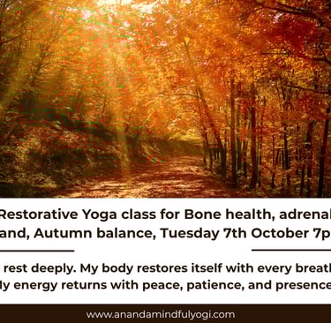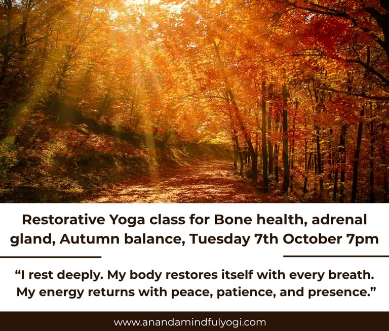 Restorative Yoga class for Bone health, adrenal gland, Autumn balance, Tuesday 7th October 7pm